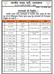 देहरादून। भाजपा ने प्रदेश मे सभी नगर निगम, नगर पालिका तथा नगर पंचायतों मे चुनाव संचालन के लिए समन्वयक नियुक्त...