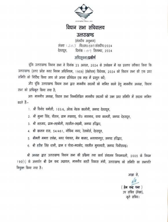 विधायक विनोद चमोली , मुन्ना सिंह चौहान, शाहजाद, खजान दास, ममता राकेश , ओर हरीश धामी को प्रवर समिति का सदस्य बनाया गया है