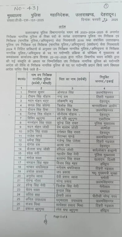 अनुसार उप निरीक्षक नागरिक पुलिस/अभिसूचना से निरीक्षक, नागरिक पुलिस/अभिसूचना के पद पर पदोन्नति प्रक्रिया के परिप्रेक्ष्य में मुख्यालय के समसंख्यक कार्यालय ज्ञाप दिनांकः 22-02-2025 द्वारा गठित विभागीय चयन समिति द्वारा की गई संस्तुति के आधार पर निम्नलिखित उप निरीक्षक नागरिक पुलिस को पदोन्नति आदेश की तिथि से निरीक्षक नागरिक पुलिस के पद पर पदोन्नति प्रदान किये जाने विषयक आदेश पारित किये जाते हैं
