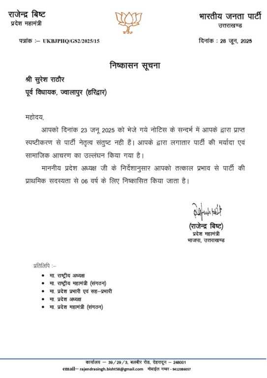भाजपा ने पार्टी के पूर्व विधायक सुरेश राठौड़ को 6 साल के लिए निष्कासित कर दिया है. कुछ दिन पहले भाजपा ने पूर्व विधायक सुरेश राठौड़ को नोटिस जारी किया था जिसमें अभद्र भाषा के इस्तेमाल करने का आरोप लगाया था फिलहाल भाजपा प्रदेश प्रवक्ता विनोद सुयाल का कहना है कि गलत आचरण करने वालों के लिए पार्टी में कोई जगह नहीं है ।
