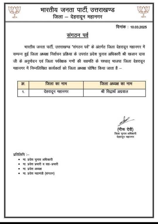 देहरादून महानगर अध्यक्ष पद पर रिपीट हुए सिद्धार्थ अग्रवाल।