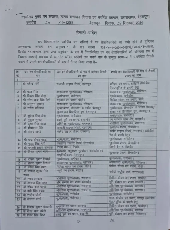 वन विभागान्तर्गत अक्षेत्रीय वन राजियों में वन क्षेत्राधिकारियों की कमी होने के दृष्टिगत उत्तराखण्ड शासन,वन अनुभाग-1 के पत्र संख्या 1735/x-1-2024-04(13)/2006/E-59863. दिनांक 13.09.2024 द्वारा प्राप्त अनुमोदन के क्रम में निम्नलिखित उप वन क्षेत्राधिकारियों को वरिष्ठता क्रम में नितान्त अस्थाई व्यवस्था के अन्तर्गत अग्रिम आदेशों तक उनके नाम के सम्मुख स्तम्भ-4 में उल्लेखित तैनाती प्रभाग में प्रभारी वन क्षेत्राधिकारी के रूप में तैनात किया जाता है