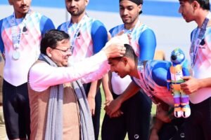 मुख्यमंत्री ने गुरुवार को मनोज सरकार स्पोर्टस स्टेडियम में 38वें राष्ट्रीय खेलों के अन्तर्गत शिवालिक वेलोड्रम मे टैªक साइकिलिंग प्रतियोगिता को दर्शक दीर्घा से देखा। उन्होंने वेलोड्रम पहुंचकर खिलाड़ियो से परिचय प्राप्त कर टैªक पर साइकिलिंग भी की। इसके बाद मुख्यमंत्री ने पुरूष वर्ग के टीम परस्यूट डिस्टेंस 4000 मीटर प्रतियोगिता में स्वर्ण पदक विजेता सर्विसेज स्पोर्टस कंट्रोल बोर्ड, रजत पदक विजेता पंजाब व कांस्य पदक विजेता राजस्थान को मैडल व पहाड़ी टोपी पहनाकर सम्मानित किया। इसके उपरान्त मुख्यमंत्री ने खिलाड़ियों के साथ भोजन किया व खिलाड़ियों के लिए की गई व्यवस्थाओं के बारे में खिलाड़ियों से जानकारी ली जिस पर खिलाड़ियो ने सभी प्रकार की व्यवस्थाओं पर प्रसन्नता व्यक्त की।