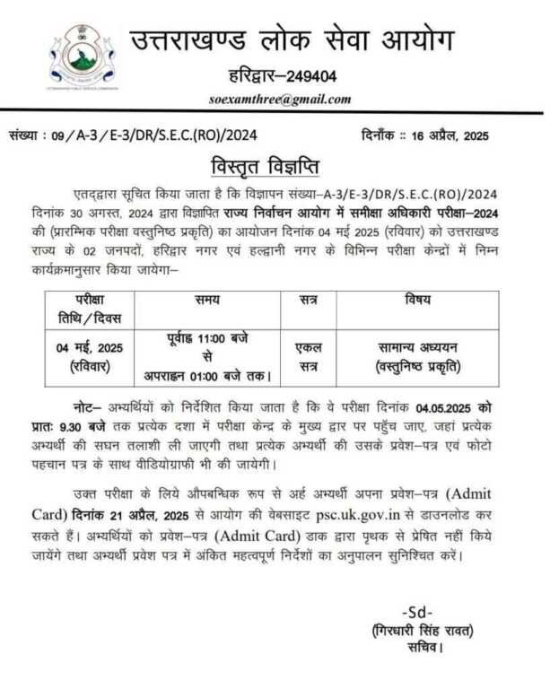 एतद्वारा सूचित किया जाता है कि विज्ञापन संख्या-A-3/E-3/DR/S.E.C.(RO)/2024 दिनांक 30 अगस्त, 2024 द्वारा विज्ञापित राज्य निर्वाचन आयोग में समीक्षा अधिकारी परीक्षा-2024 की (प्रारम्भिक परीक्षा वस्तुनिष्ठ प्रकृति) का आयोजन दिनांक 04 मई 2025 (रविवार) को उत्तराखण्ड राज्य के 02 जनपदों, हरिद्वार नगर एवं हल्द्वानी नगर के विभिन्न परीक्षा केन्द्रों में निम्न कार्यक्रमानुसार किया जायेगा-