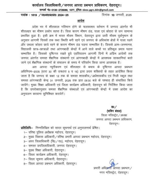 अतः आपदा न्यूनीकरण एवं शीतलहर से बचाव के दृष्टिगत आपदा प्रबन्धन अधिनियम-2005 (धारा 30 की उपधारा 5 व 18) द्वारा प्रदत्त शक्तियों के तहत आदेशित किया जाता है कि जनपद के कक्षा 12 तक के समस्त शासकीय/अर्धशासकीय एवं निजी स्कूल तथा समस्त आंगनबाडी केन्द्र 31 जनवरी, 2025 तक प्रात 08:30 बजे के पश्चात् ही संचालित किये जायेंगे। मुख्य शिक्षा अधिकारी एवं जिला कार्यक्रम अधिकारी, देहरादून को निर्देशित किया जाता है कि उपरोक्तानुसार समस्त शैक्षणिक संस्थाओं एवं आंगनबाडी केन्द्रों में उक्त आदेश का अनुपालन करवाना सुनिश्चित करायेगें।