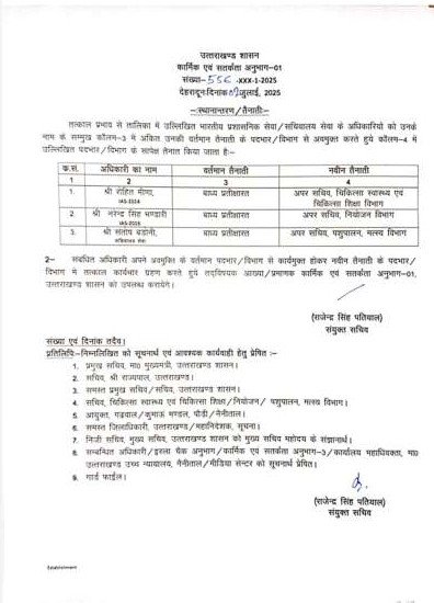देहरादून, 3 जुलाई 2025 — उत्तराखंड शासन ने बुधवार को प्रशासनिक फेरबदल करते हुए भारतीय प्रशासनिक सेवा (IAS) और सचिवालय सेवा के तीन अधिकारियों के तबादले किए हैं। इस संबंध में कार्मिक एवं सतर्कता अनुभाग-01 द्वारा आदेश संख्या 556 /XXX-1-2025 के तहत आदेश जारी किया गया है।