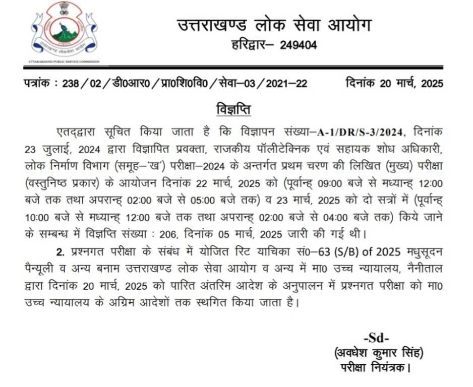 प्रश्नगत परीक्षा के संबंध में योजित रिट याचिका सं०-63 (S/B) of 2025 मधुसूदन पैन्यूली व अन्य बनाम उत्तराखण्ड लोक सेवा आयोग व अन्य में मा० उच्च्च न्यायालय, नैनीताल द्वारा दिनांक 20 मार्च, 2025 को पारित अंतरिम आदेश के अनुपालन में प्रश्नगत परीक्षा को मा० उच्च न्यायालय के अग्रिम आदेशों तक स्थगित किया जाता है