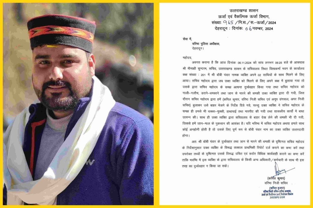 अवगत कराना है कि आज दिनांकः 06.11.2024 को सांय लगभग 06:25 बजे के आसपास श्री मीनाक्षी सुन्दरम, सचिव, उत्तराखण्ड शासन के सचिवालय स्थित विश्वकर्मा भवन के कार्यालय कक्ष संख्या: 201 में श्री बॉबी पंवार नामक व्यक्ति अपने 02 साथियों के साथ मिलने के लिए आया। सचिव महोदय द्वारा जब उक्त व्यक्ति को मिलने के लिए अपने कक्ष में बुलाया गया